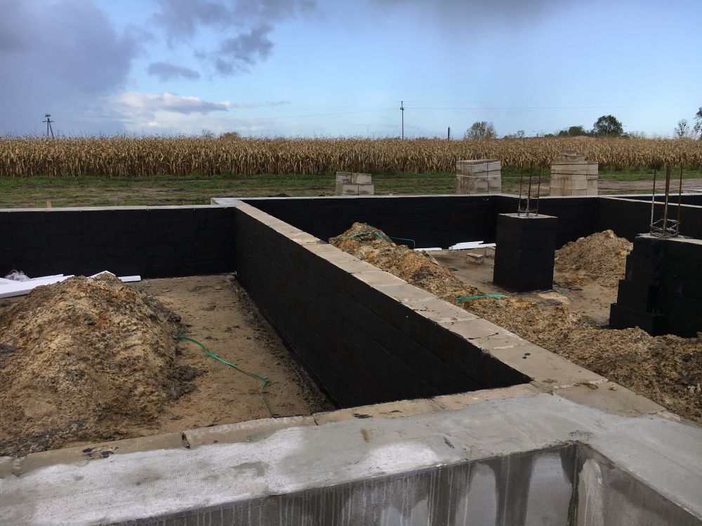 Fundamenty wymalowane dysperbitem, ocieplone styropianem i położona siatka. Niestety prace na budowie bardzo opóźnione przez ciągle padający deszcz:(